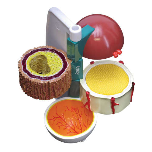 Four piece model indicating structures and organs with vascular effects due to diabetes. Includes sectioned model of Bowman’s capsule (kidney), artery, nerve, eye (posterior section).