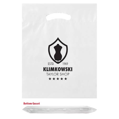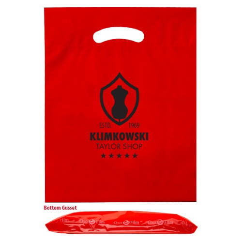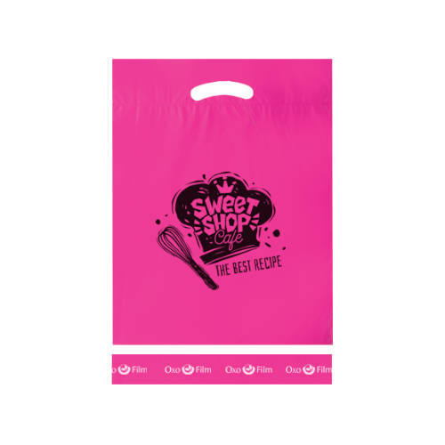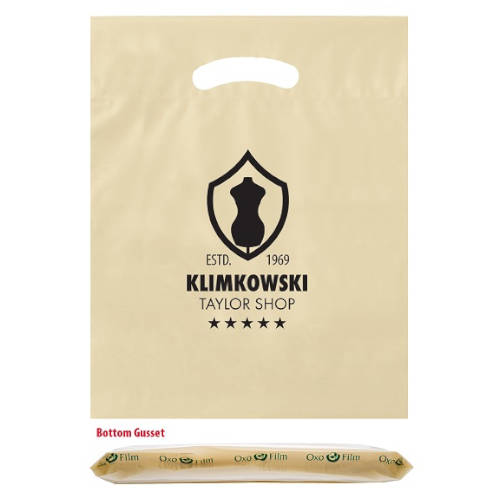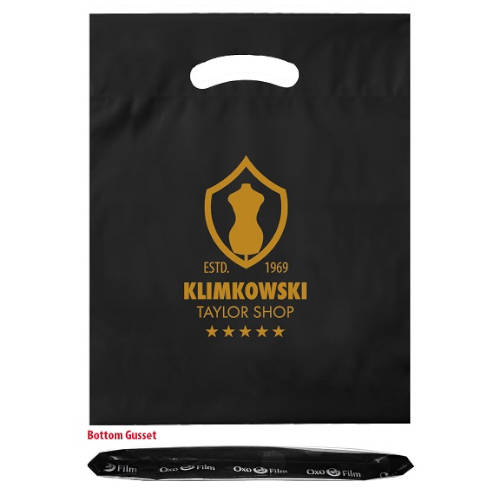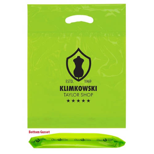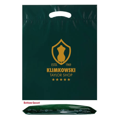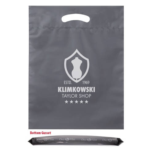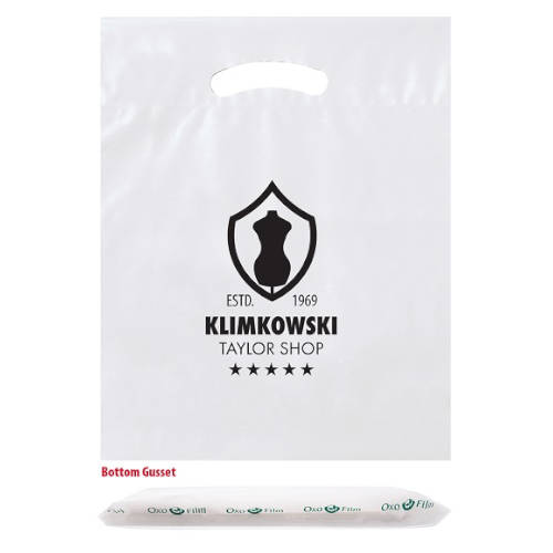 This bag is made with 2.5 Mil oxo plastic film and die cut handleis reinforced by a double layer of poly for more holding powerand insuring that this bag can be reused many times.
