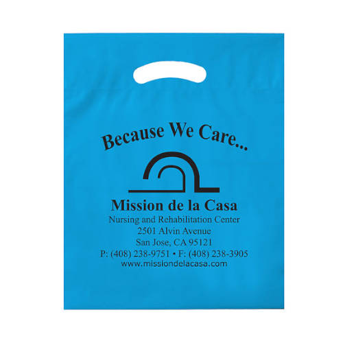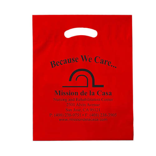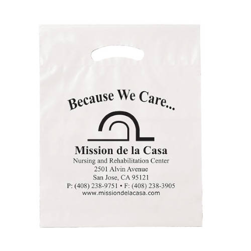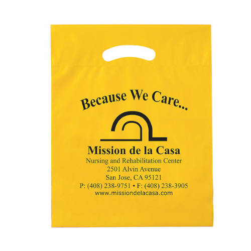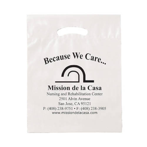 Lightweight and easy to carry, this plastic bag features a die cut fold-over reinforced handle with a 3” gusset, 2.5 mil. low density film thickness and measures 15” x 19”