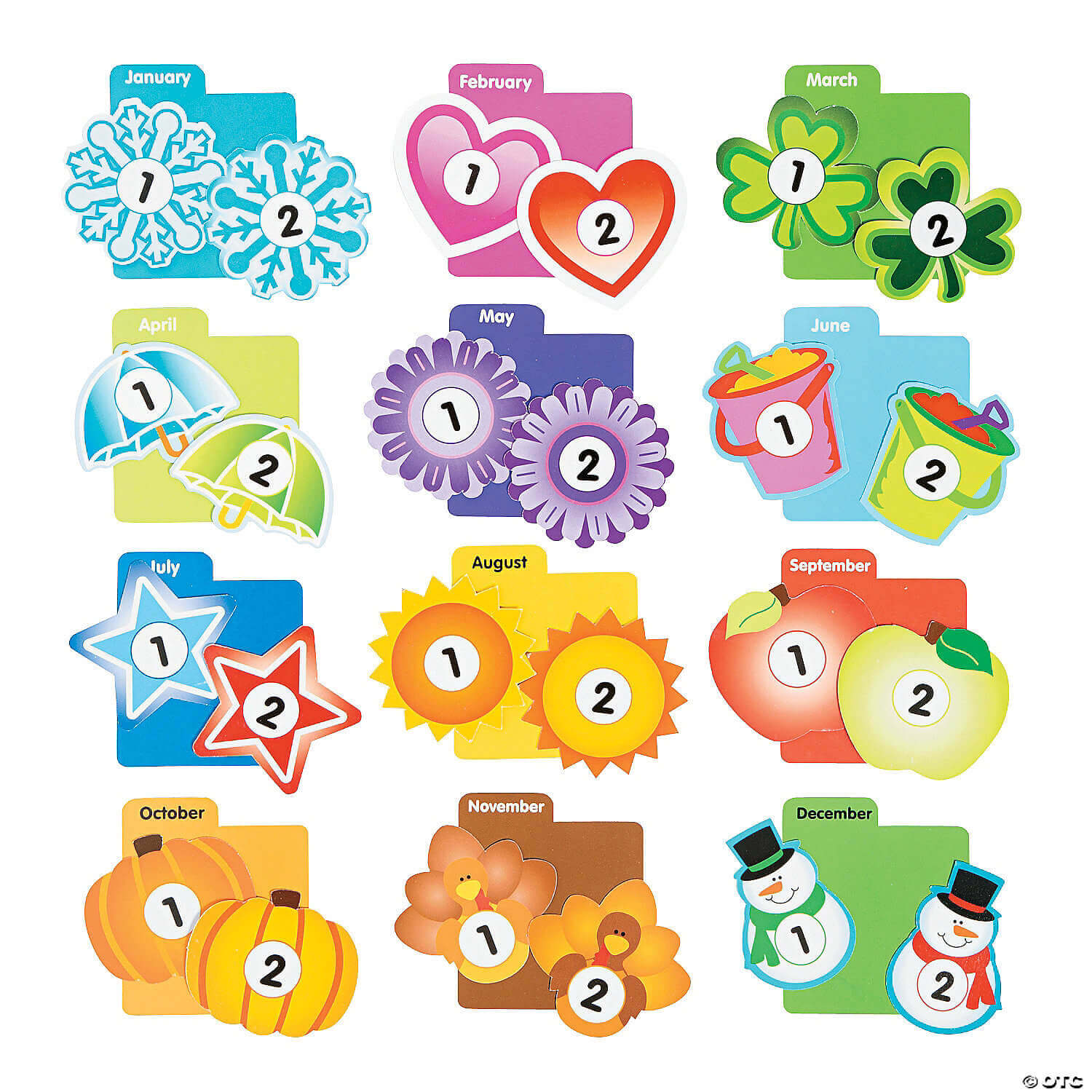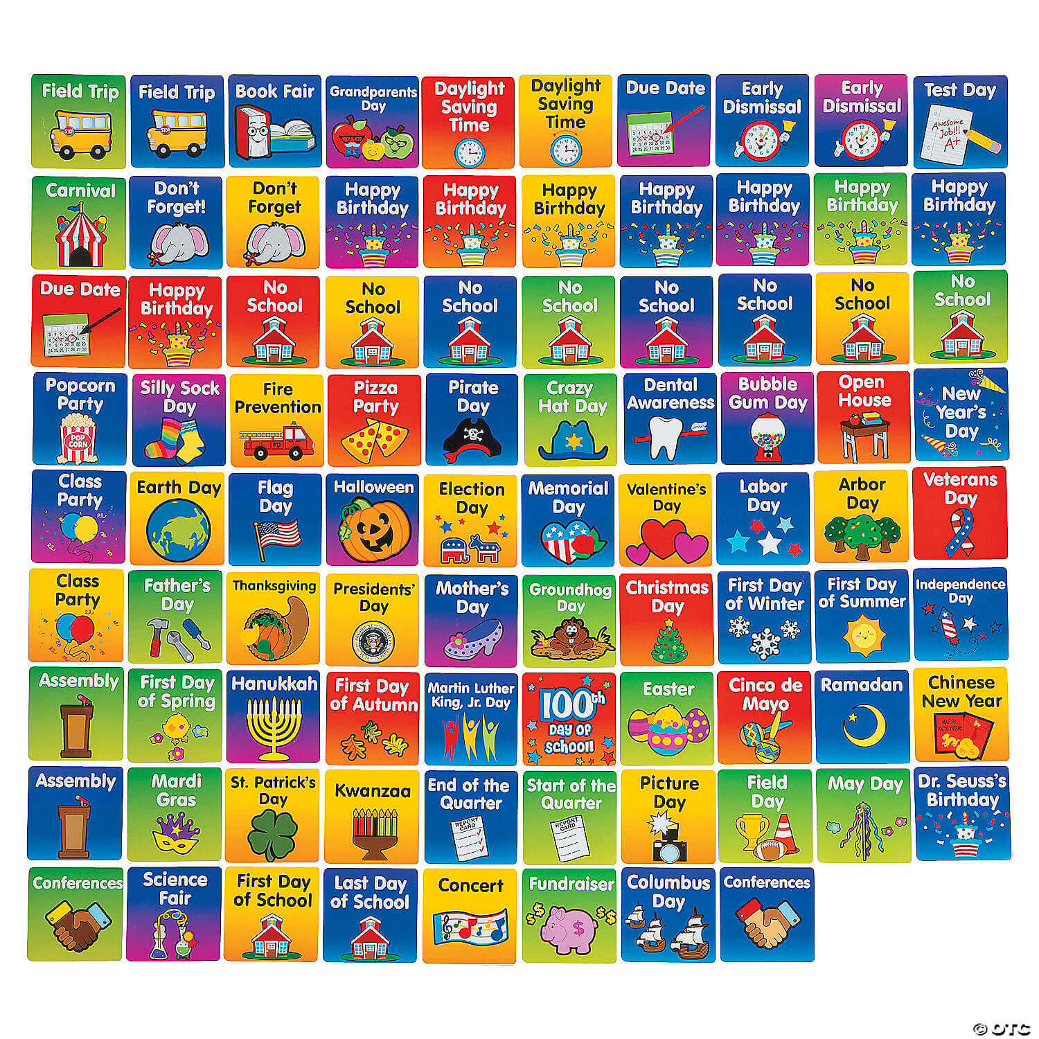 Getting ready to go back to school? Supplies like these Classroom Calendar Days of the Year are must-have teacher supplies to kick the year off right! Bright, colorful and engaging, students and teachers will love this fun classroom calendar. Includes 366 double-sided daily calendar cutouts and 96 additional cards for holidays and write-ins. Cardstock. (462 pcs. per unit) 3″ ©Oriental Trading Company