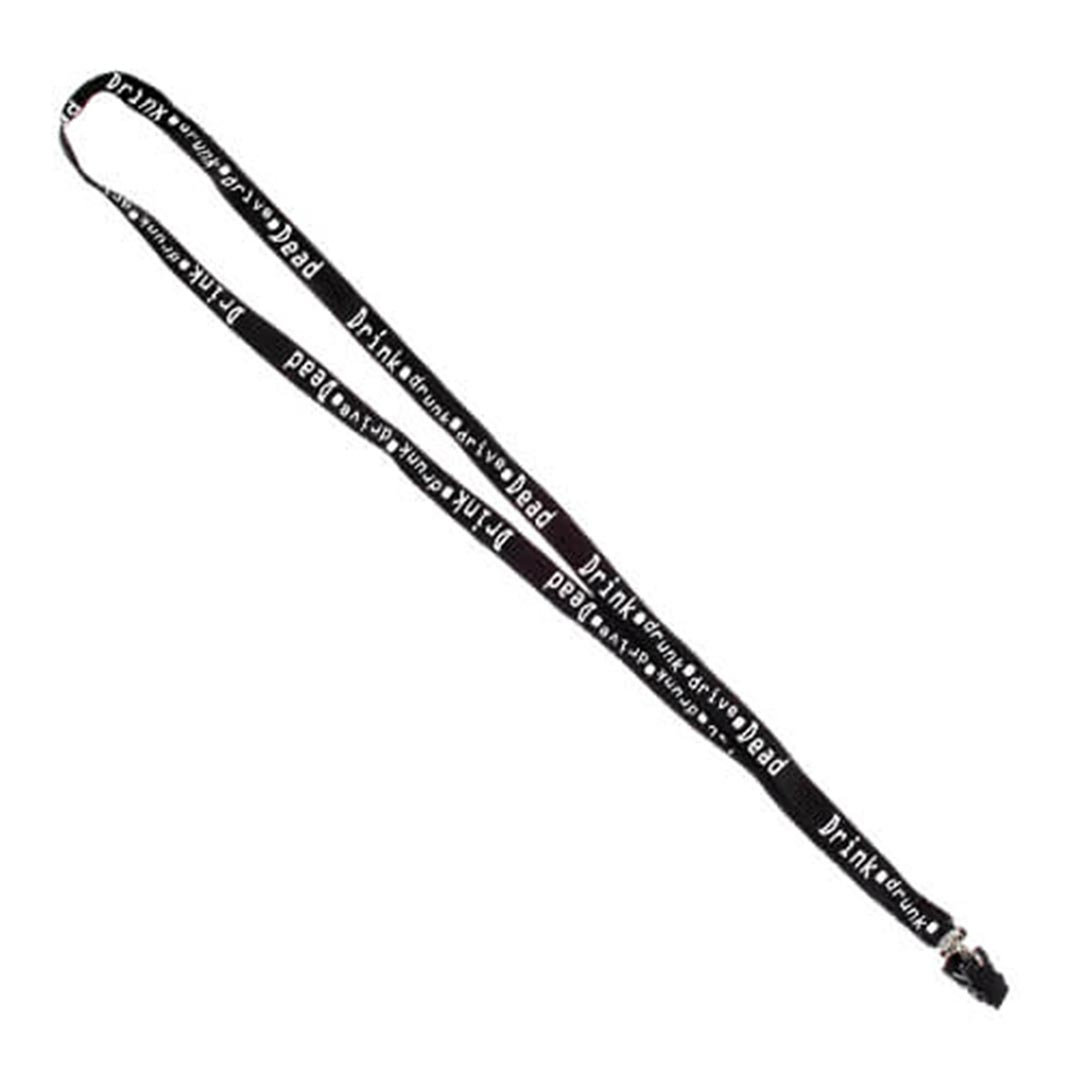 A black cloth lanyard without a break-away clip. White imprint reads: Drink-drunk-drive-Dead. Sold individually. (Custom Options are NOT Available)