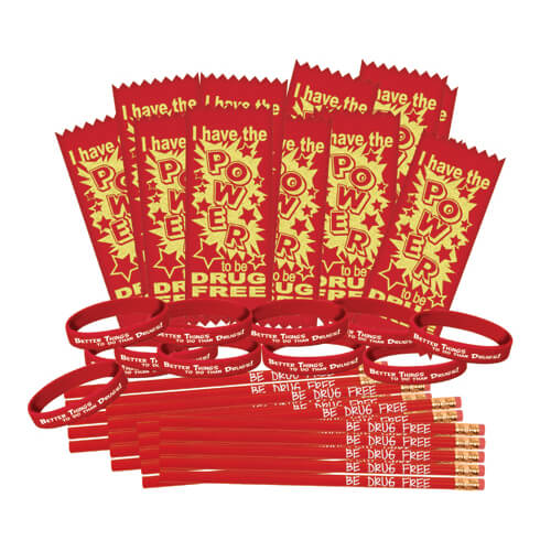 300 items in all! Includes:™100 Pencils, 100 Self-Stick Ribbons, and 100 Silicone Bracelets. All products feature a “Drug-Free” message (slogans may vary). You save 18% off our individual prices. Combined price if purchased separately $133.25.