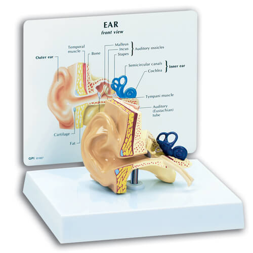 Full size model shows: Semi-circular canals and cochlea of the inner ear * Auditory ossicles from the middle ear * Tympanic membrane and temporal * Tympani muscles * Model size: 3-3/4″ x 2-1/2″ x 2-3/4″ * Card size: 6-1/2″ x 5-1/4″