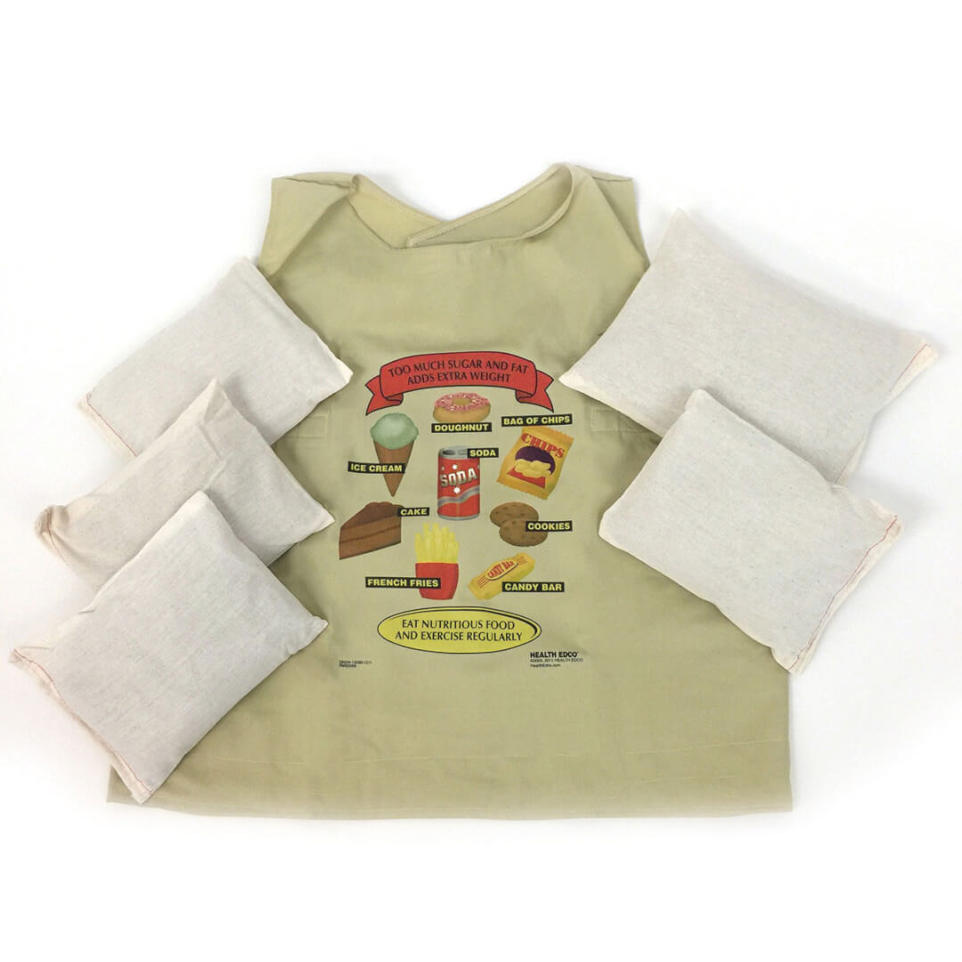 Teaching tool, which simulates the “look” and “feel” of excess body fat * By inserting weights in varying increments into the vest’s interior pocket, the wearer can experience the additional weight and limited range of motion that are associated with obesity * An excellent way to start group discussion about healthy eating habits * Adult model includes a total of 20 lbs of weight (three 5 lb weights and two-2 _ lb weights) * Child Model includes a total of 15 lbs of weight (one 5 lb and four 2 _ weights)