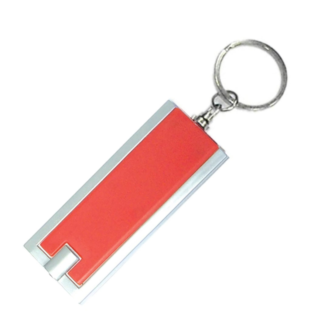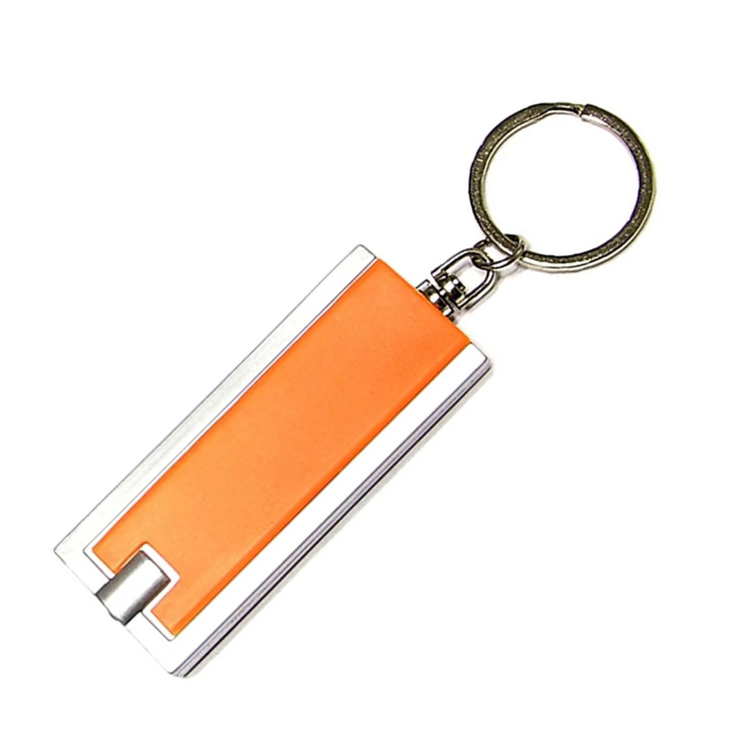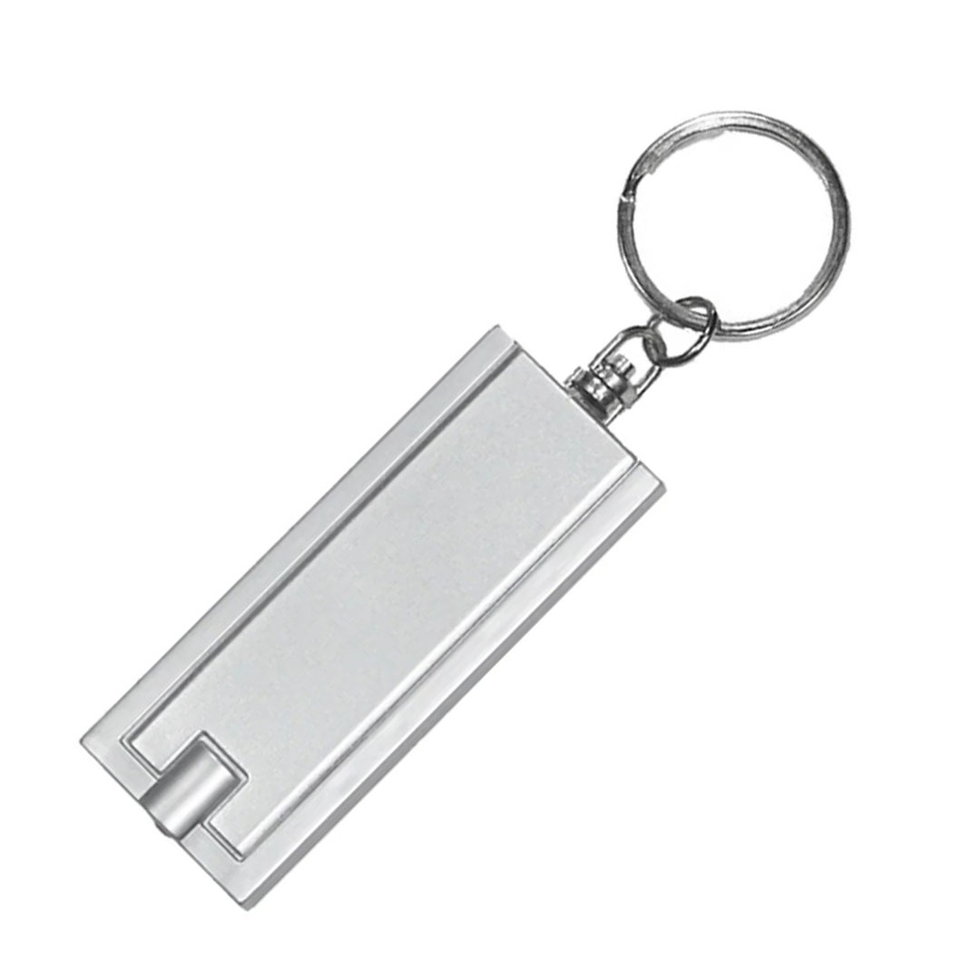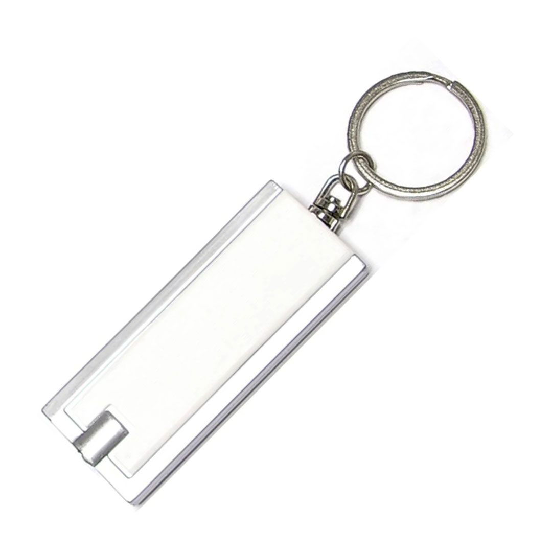 Slim flash light with super bright LED light. Flat rectangular body with silver trim. Non-translucent design. No six black spots seen on the imprint area. Long life lithium batteries included. Up to 30 hours continuous lighting time. 100,000 hours of life time for the LED light bulb. Three years on shelf time! Great gift for thin key holder, key tag, key chain, key ring, safety, emergency.