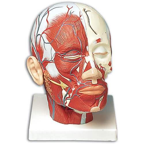 Representation of the superficial musculature of head and neck * Shows the following: Parotid gland; Submandibular gland (right half); Deep musculature (left half); Lower jaw partially exposed * Displays blood vessels * 24x18x24