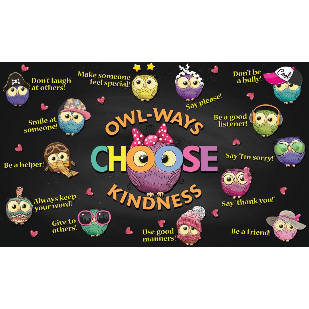 This fun and eye-catching 3’x5′ banner features lovable owls with positive messages that promote a kinder world. Simple phrases like “Don’t laugh at others,” “Be a helper,” and “Don’t be a bully” promote kindness and respect in an easy-to-understand way.