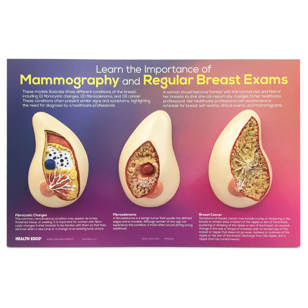 The handpainted, 3-D breast models on this display (17″ x 11″) feature the anatomy of three different breast conditions. Breasts with fibrocystic changes, a fibroadenoma, and a malignant tumor are depicted, reinforcing the importance of breast exams and mammography. Great for raising awareness about the early detection of breast cancer. Giving an inside view to emphasize why breast exams and mammograms are important tools in the early detection of breast cancer, the 3-D models on this tabletop display depict a breast with fibrocystic changes, a breast with a fibroadenoma, and a breast with a malignant tumor.