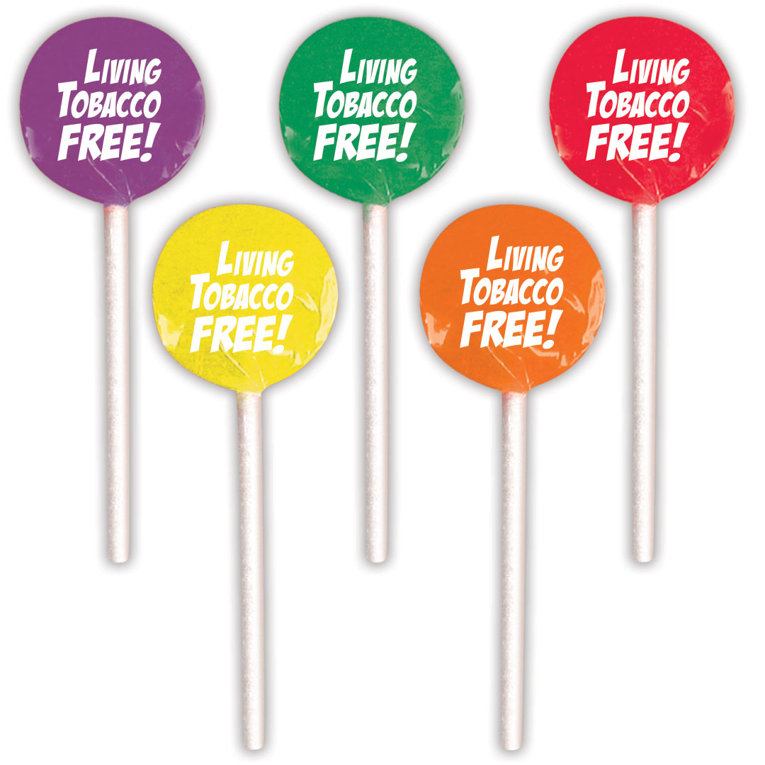 Sucker has stock design “Living Tobacco Free!” as shown in picture. Set of 1000 suckers.