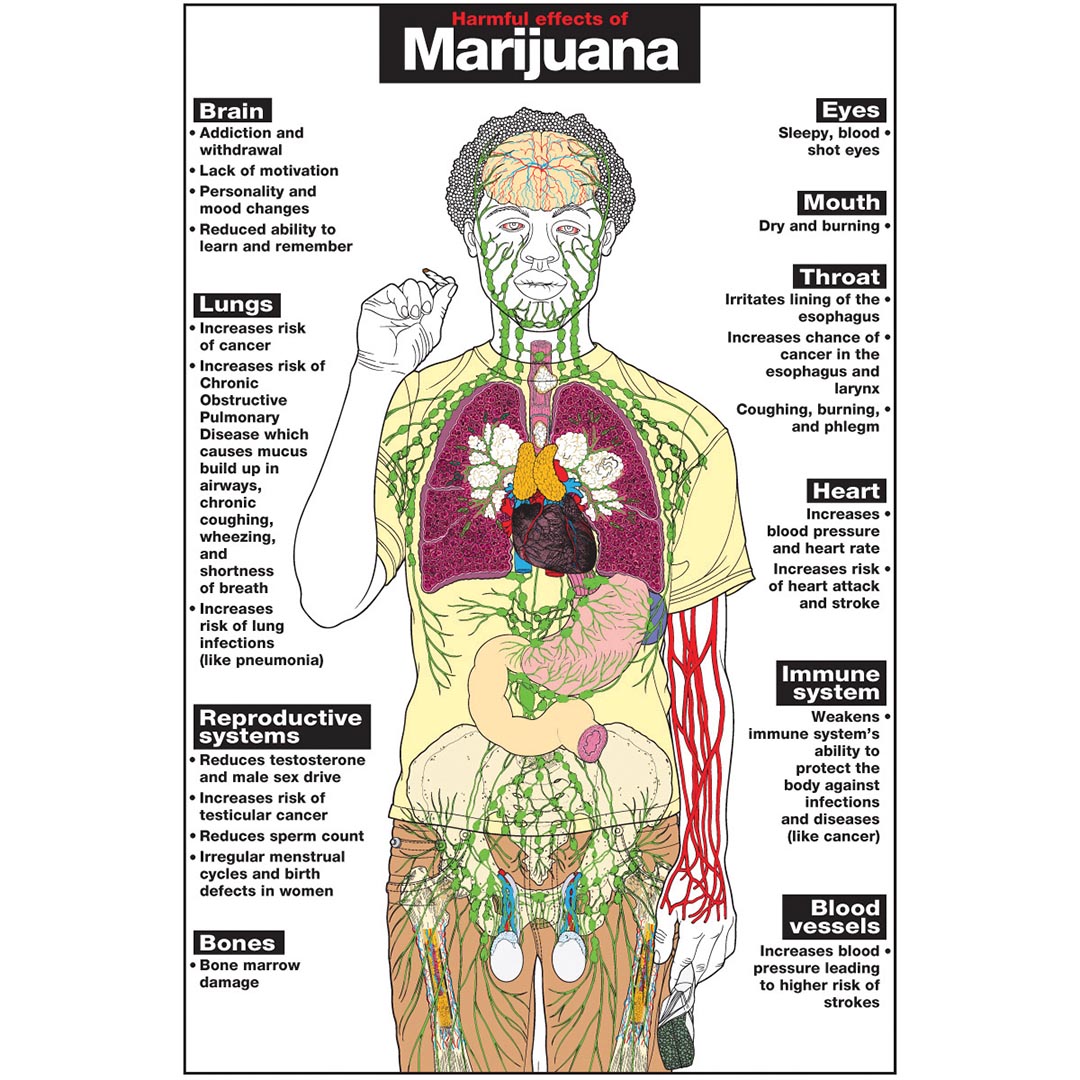 24″ x 36″ Laminated. Explains potential health consequences of using Marijuana. Harmful affects are listed and overlays of the internal body systems are attached to the statements. Grades 5-12