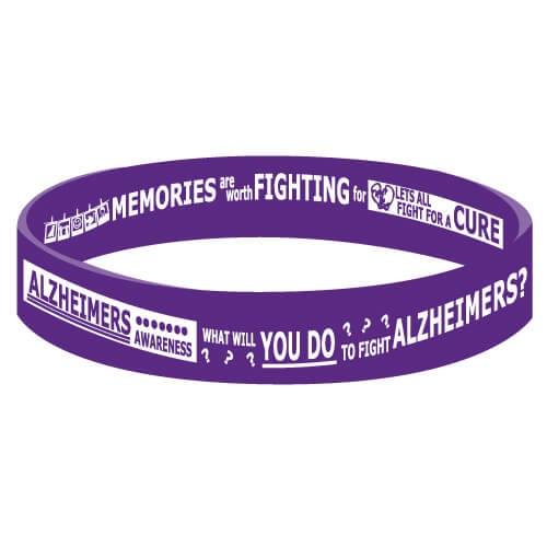 Alzheimer’s Awareness. Size Adult 8″. Wristbands are made of 100% silicone and are made to the exact specifications and quality of the popular LiveStrong® wristbands. Bracelets have reversible imprints. Flip the bracelet to show off both great messages.
