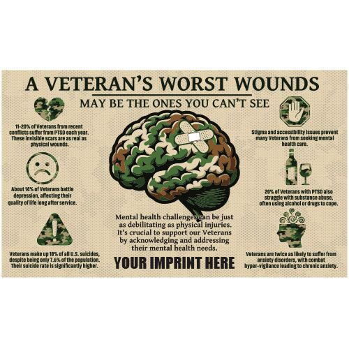 Honor our heroes and raise awareness about veteran mental health. Our customizable 3’x5′ banner features a powerful image of a brain wrapped in band-aids, symbolizing the invisible wounds of war. Add your organization’s logo or message for a personalized touch.