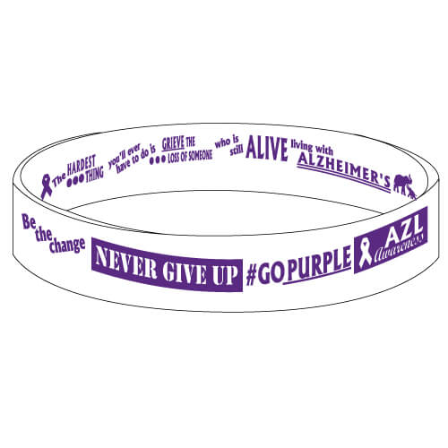 Alzheimer’s Awareness. Size Adult 8″. Wristbands are made of 100% silicone and are made to the exact specifications and quality of the popular LiveStrong® wristbands. Bracelets have reversible imprints. Flip the bracelet to show off both great messages.