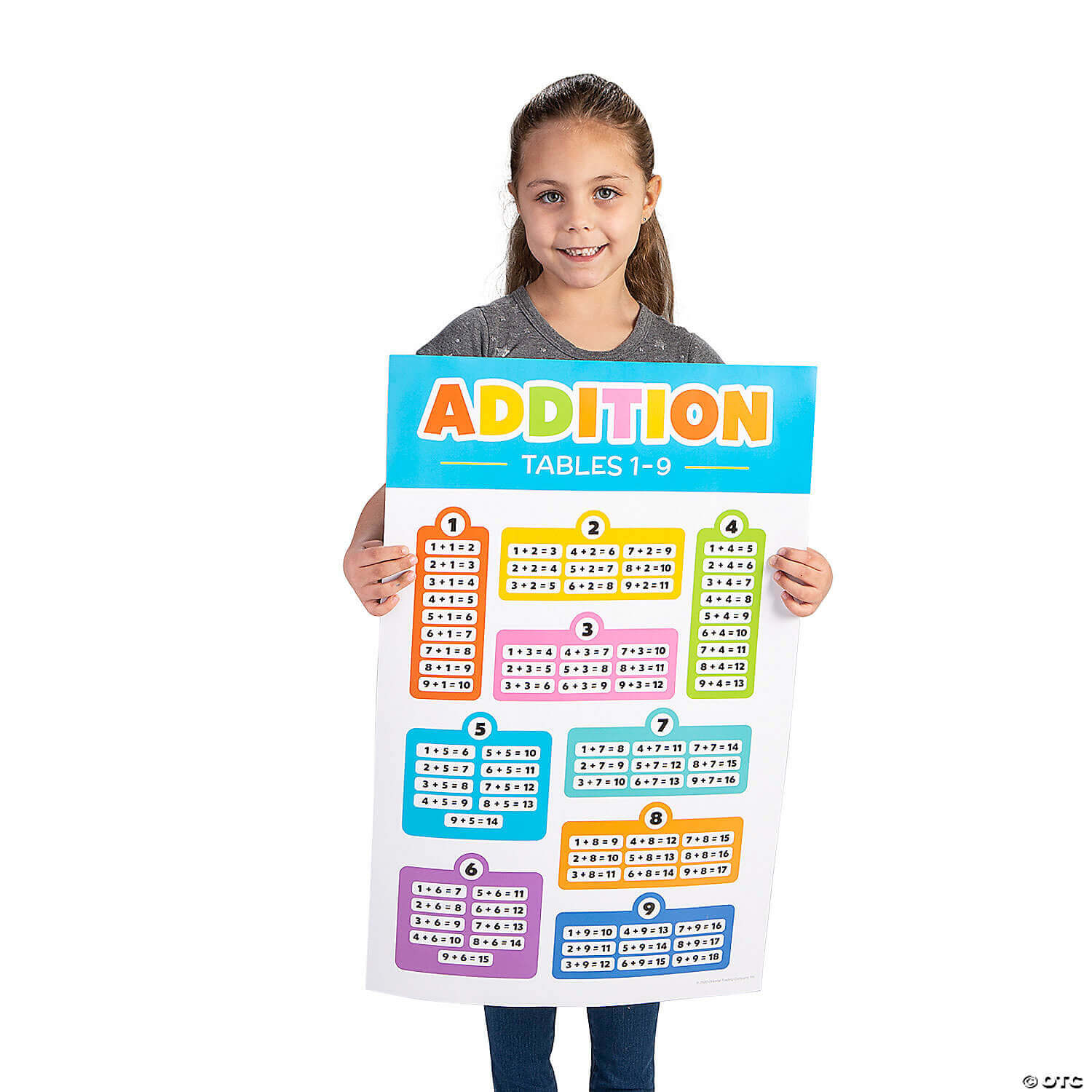 Help visual learners in the classroom learn their addition and subtraction tables with these brightly colored posters. Featuring tables 1-9, each poster helps with repetition and memorization as kids see the posters each day. These classroom wall decorations double as learning aids and add some bright color to the classroom or home learning space. Cardstock. (2 pcs. per unit) 17″ x 26″ ©Oriental Trading Company