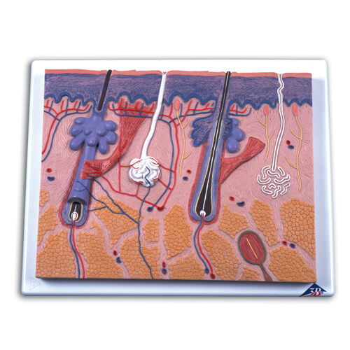 This relief model shows a section through the three layers of the hair-covered skin of the head * Supplied on a base that shows: Representation of hair follicles with sebaceous glands * Sweat glands * Receptors * Nerves * and Vessels * 26x33x5 cm