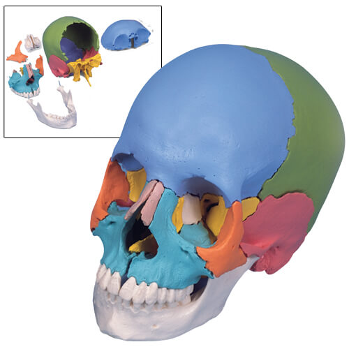The human skull consists of many individual bones that gradually grow together as the development proceeds * The new 3B Scientific Skull Kit is a natural cast and makes the complex structure of the skull easy to understand, since it can be disassembled into 22 individual bones * The individual bones can be reassembled by means of inconspicuous, stable connectors attached at the slightly simplified skull sutures * The 22 bones are depicted in 9 different didactic colors so that the individual skull bones are easy to distinguish * Each pair of bone plates has the same color * Model * Grade 9-Adult