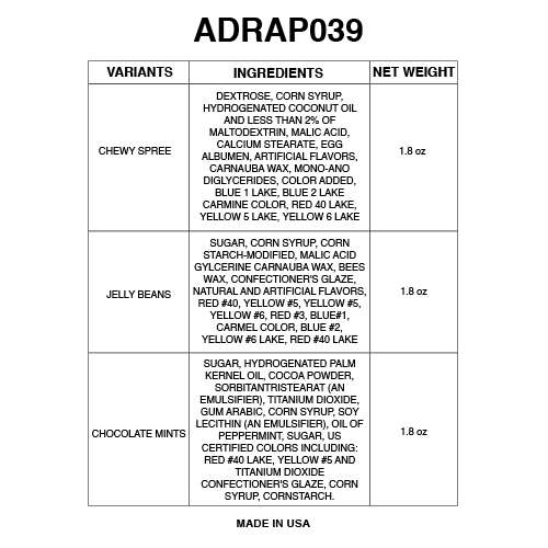 NET WEIGHT: Peanuts (0.6 oz), Mike & Ikes (0.8 oz), Almonds (0.5 oz), Pistachios (0.5 oz), Skittles (0.8 oz), Trail Mix (0.6 oz), Jelly Beans (0.8 oz)
