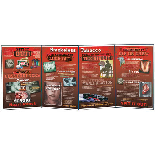 Addressing issues that are important to teens, this folding display shows smokeless tobacco’s negative effects on health and physical appearance and reveals how tobacco advertisements attempt to lure young people into a lifetime of tobacco addiction. Display Measures 58″ x 22 1/2″ when opened. Comes with 25 re-orderable minitexts