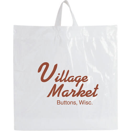 This bag is made with plastic fused White soft loop handles and 6” gusset and 3.0 mil low density film thickness