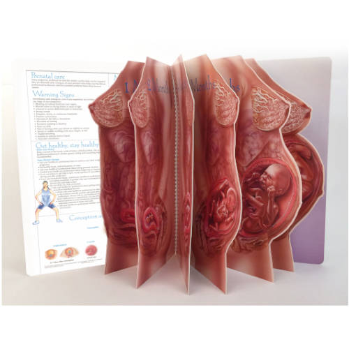 A dramatic, compelling, informative teaching tool. Beautifully illustrated, full-color standing display shows the childbearing cycle from preconception through six weeks postpartum. Overlapping images reveal the progressive changes in the mother and fetus at one, three, five, seven, and nine months. Can be used as a table-top display for classes or for exhibits. 16 pages. 18″ x 24″